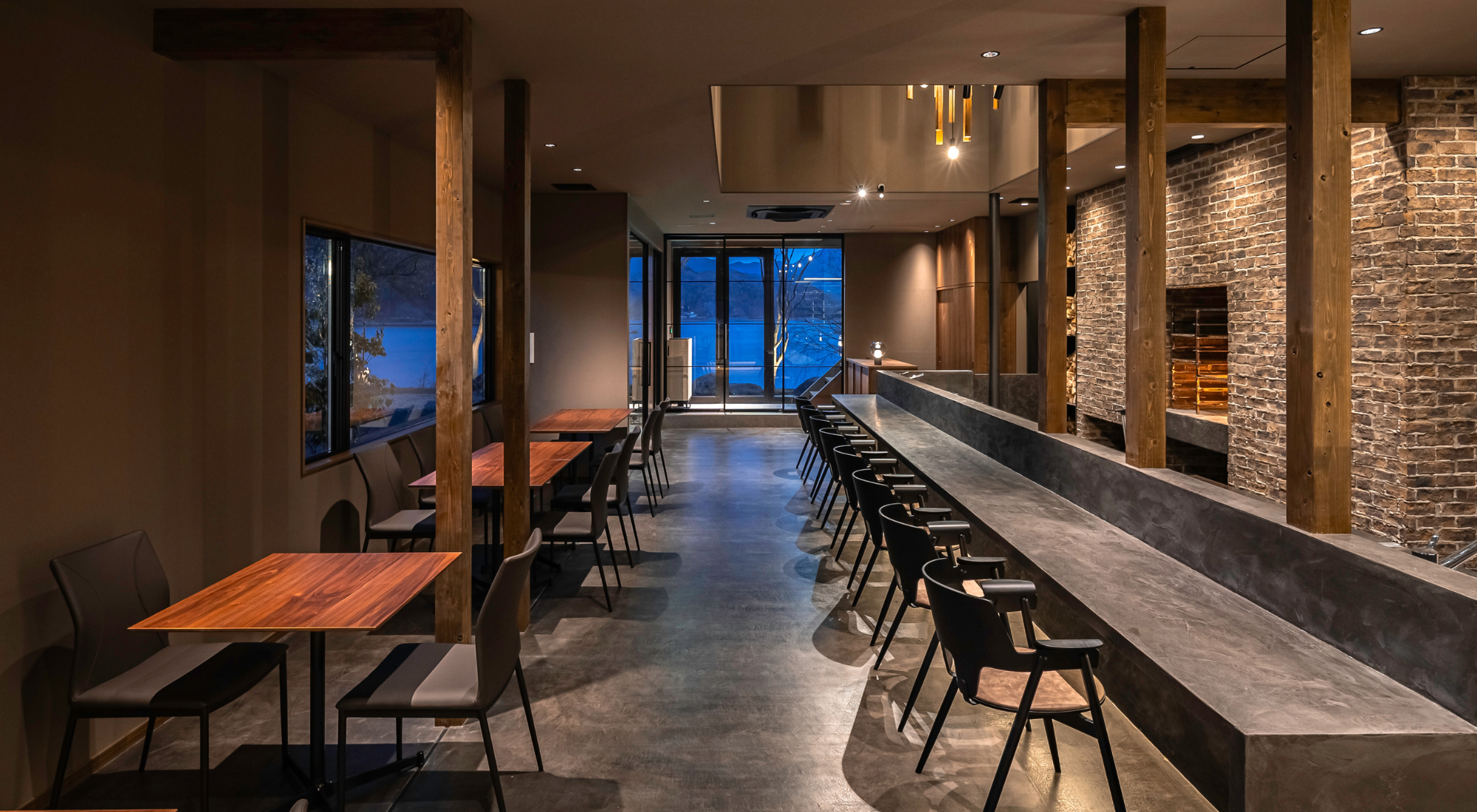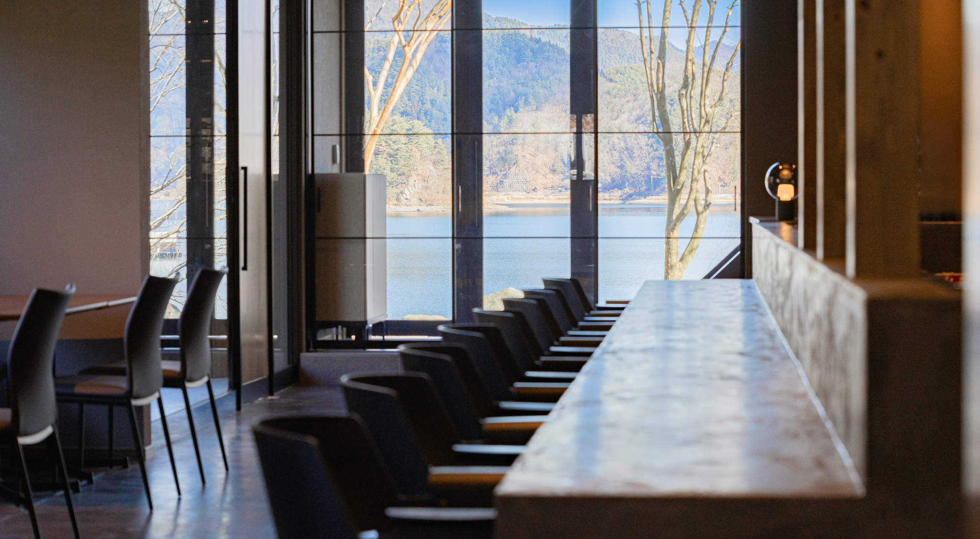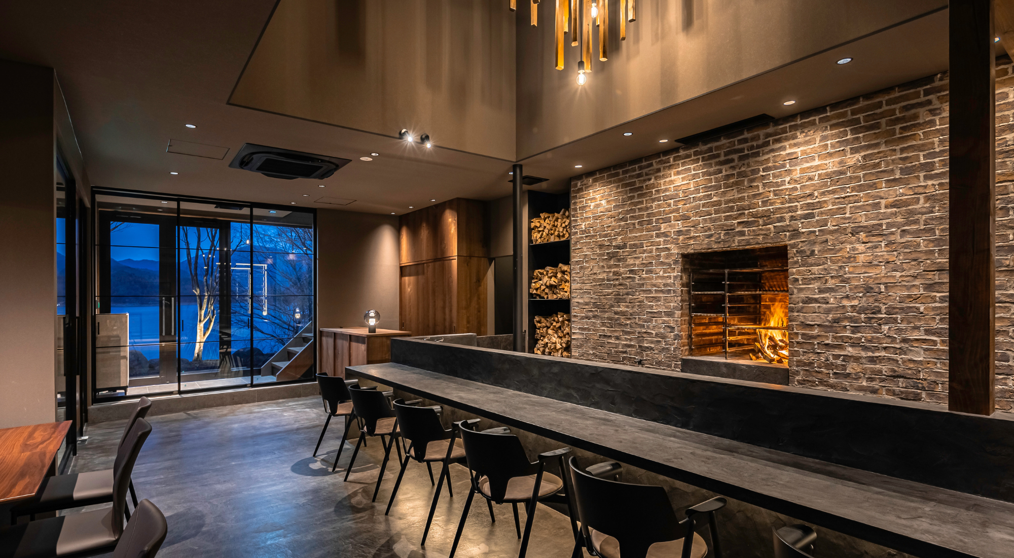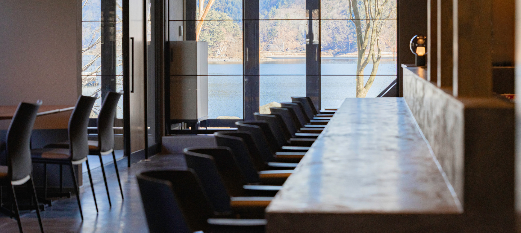 夜はガラス越しに河口湖を望むBARとして、深い夜のはじまりに。