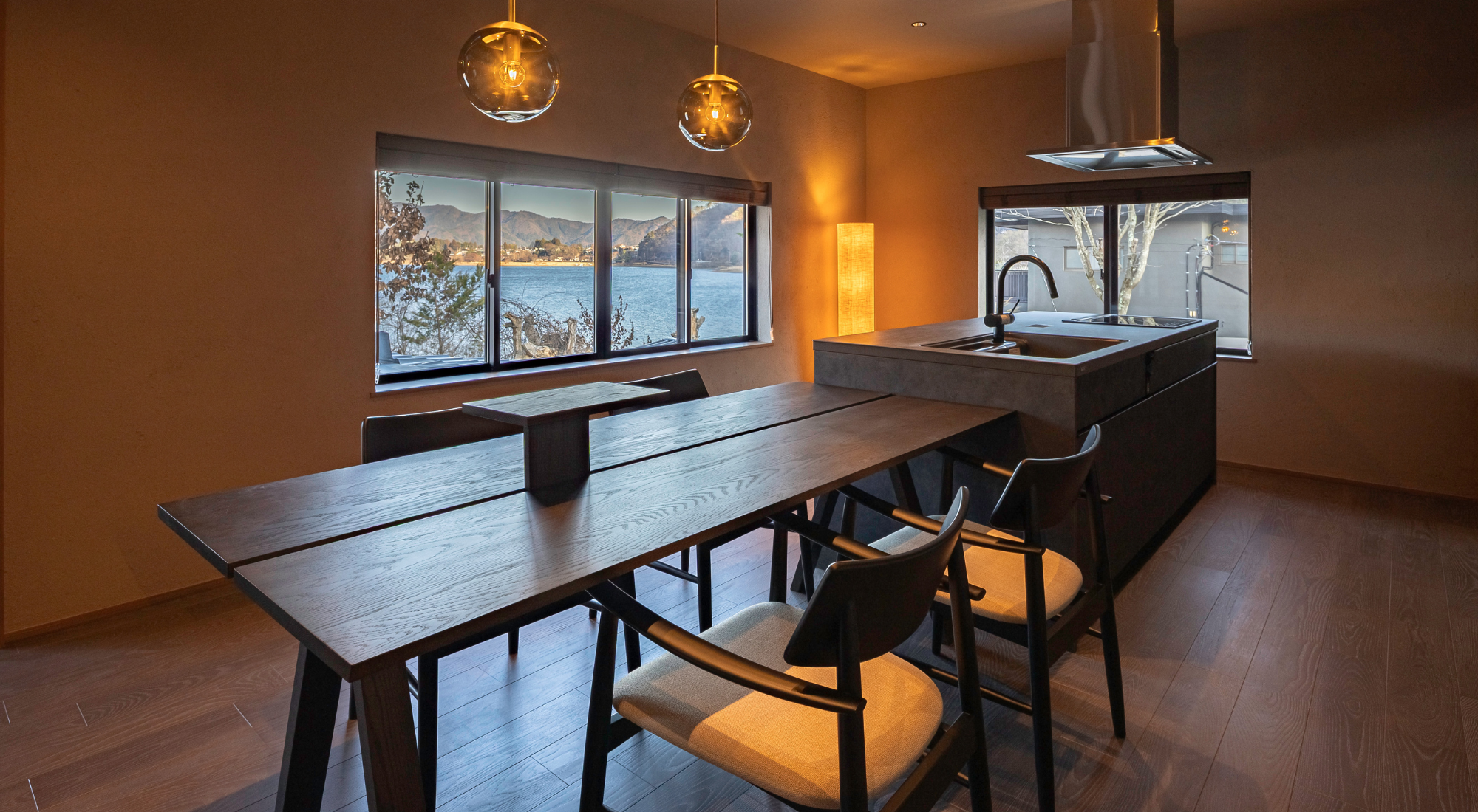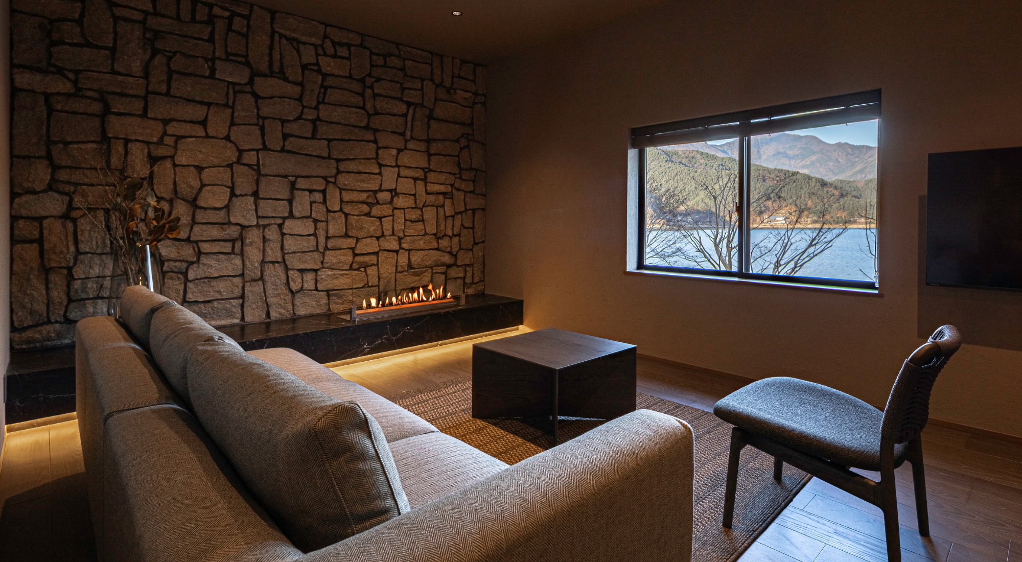 河口湖を望むリビングでは、暖炉の揺らめく火を眺めながら、