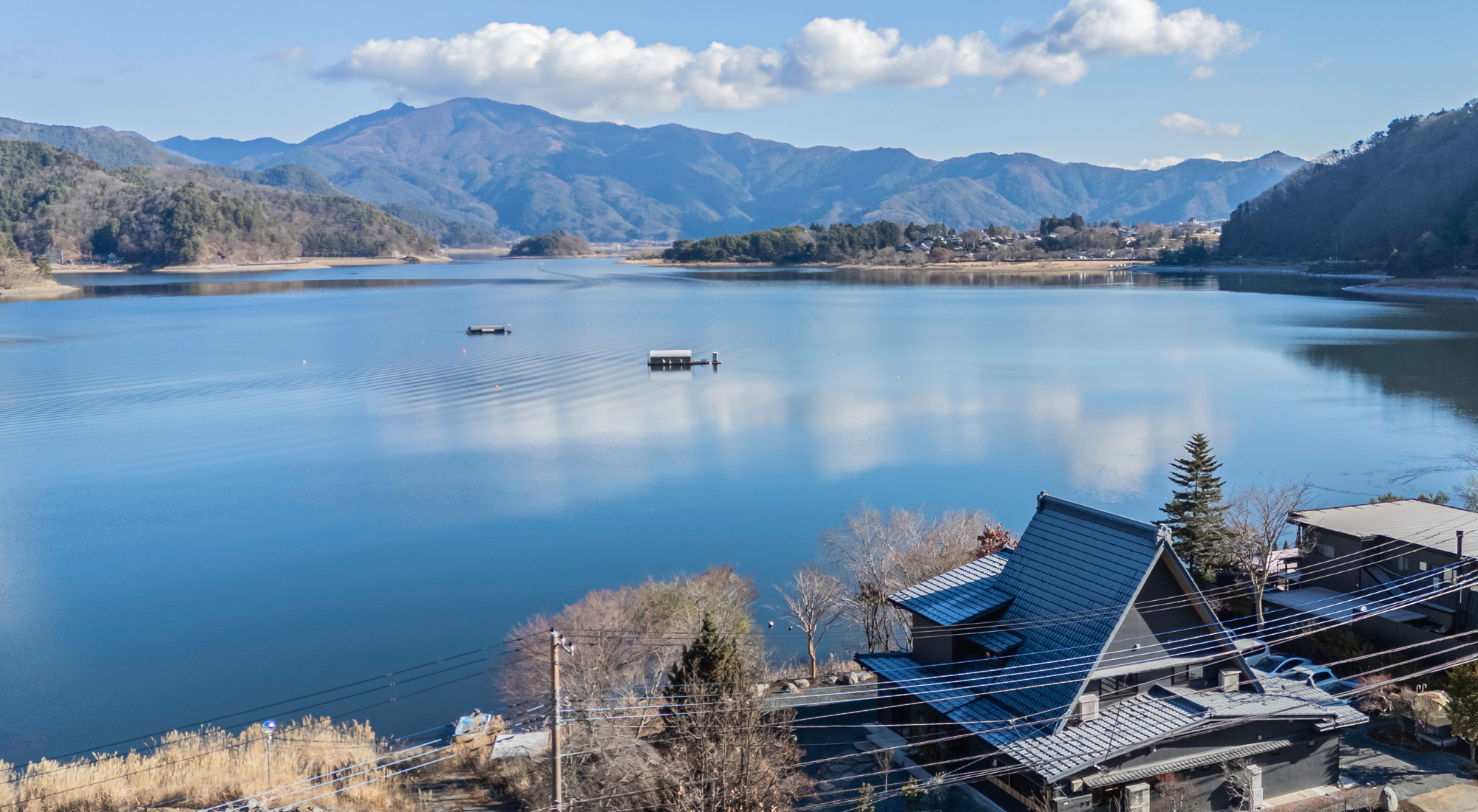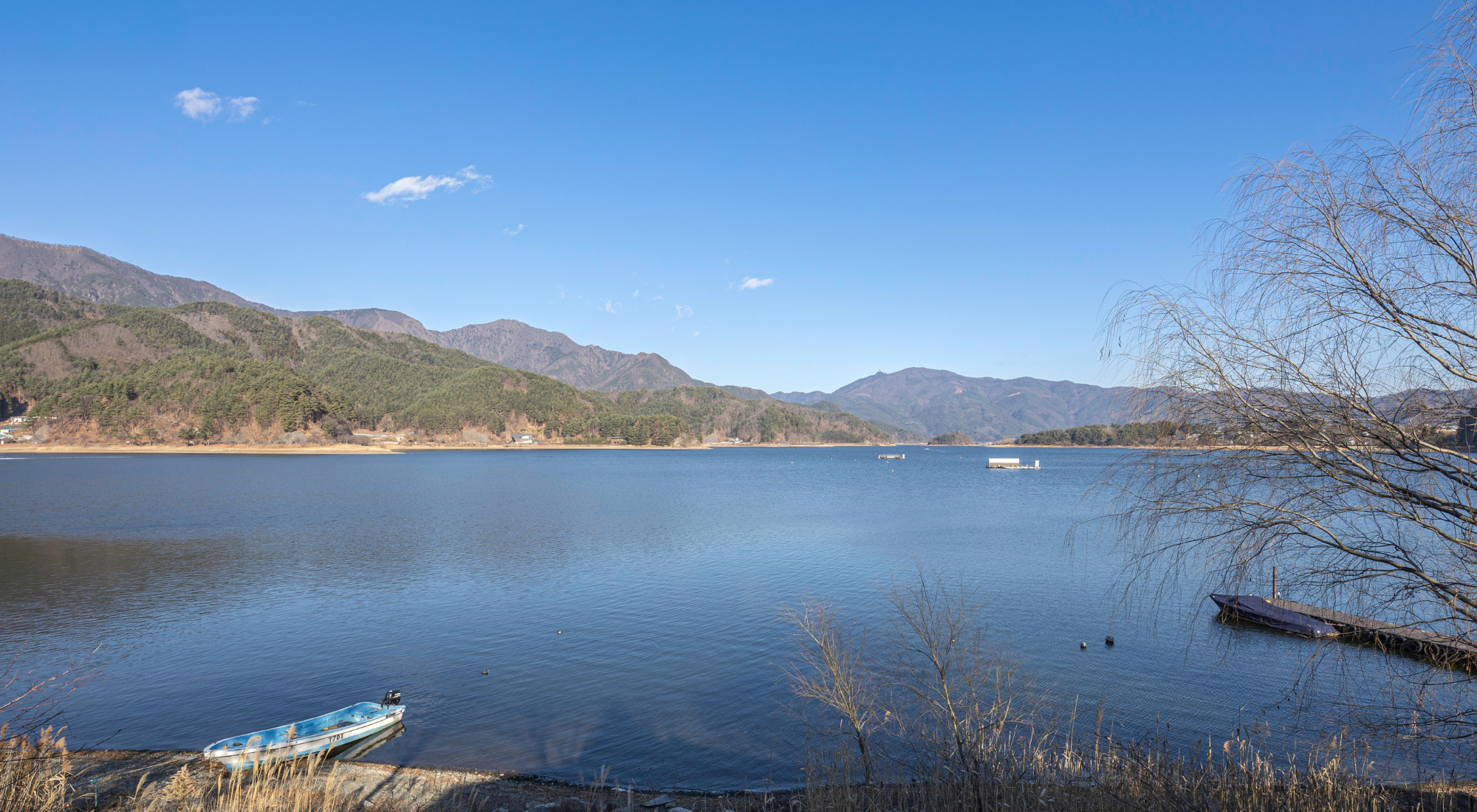 穏やかに湖⾯に映る緑と空、⼭々の⾊がたゆたう河口湖。